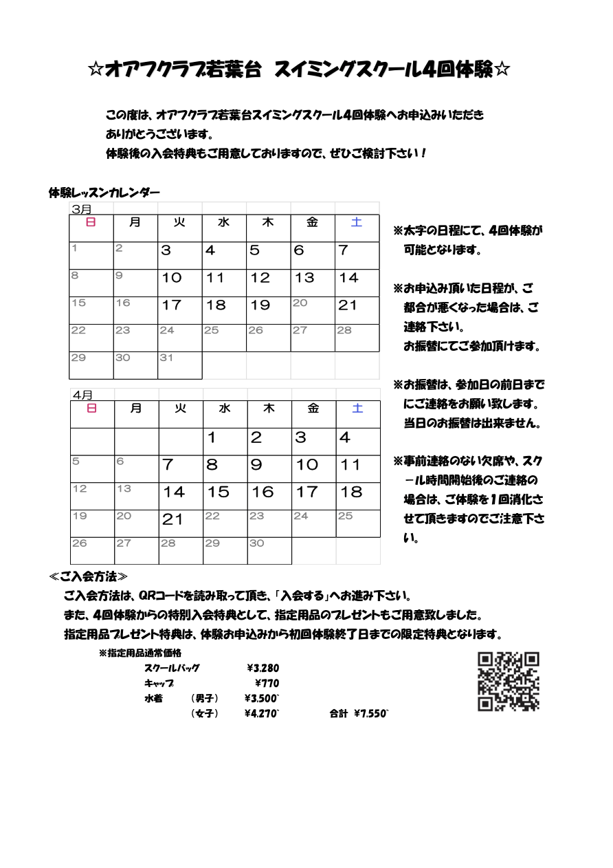 スイミング4回体験教室|オアフクラブ若葉台