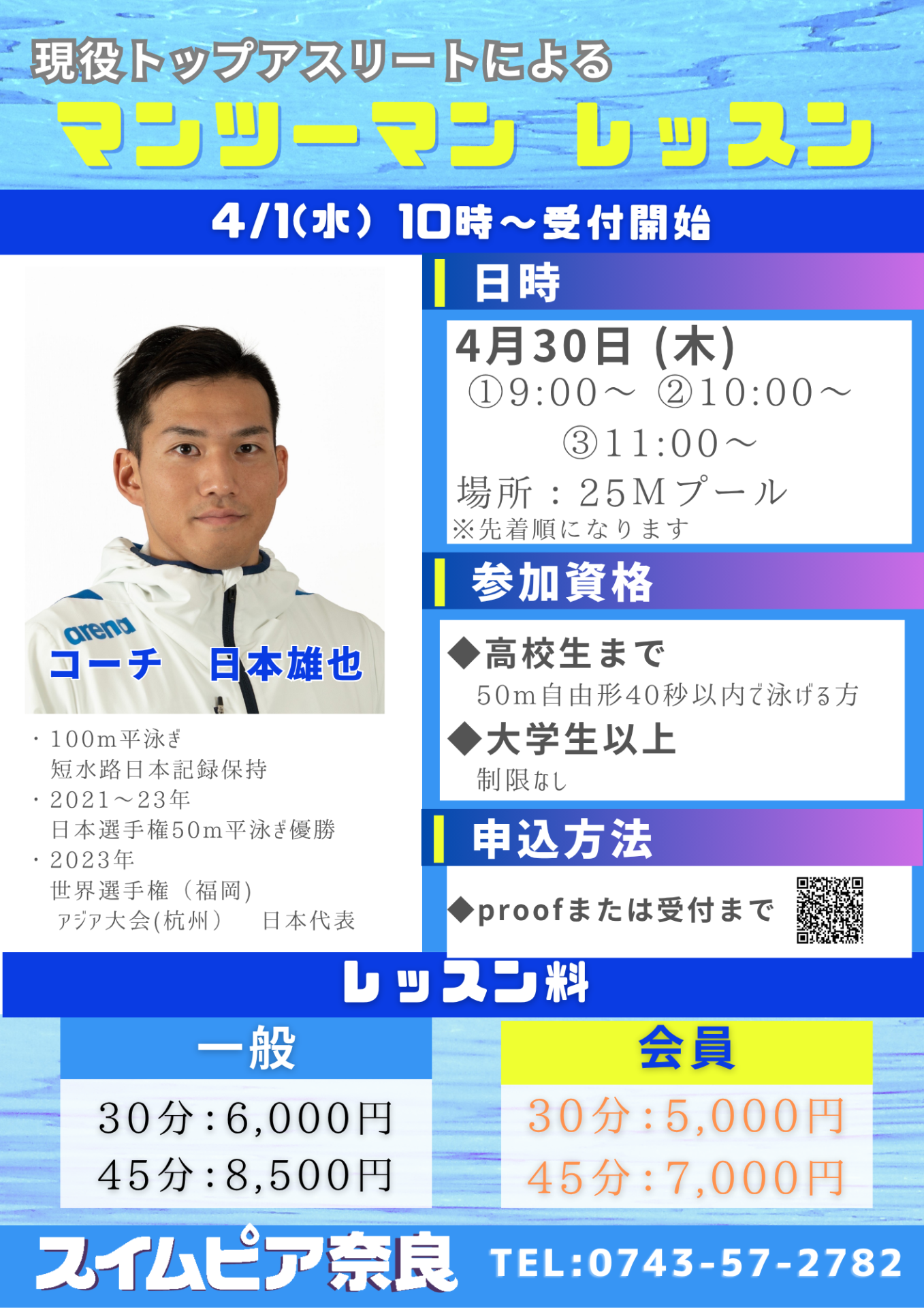 レッスン詳細: 【4月】現役トップアスリートによるマンツーマンレッスン|スイムピア奈良