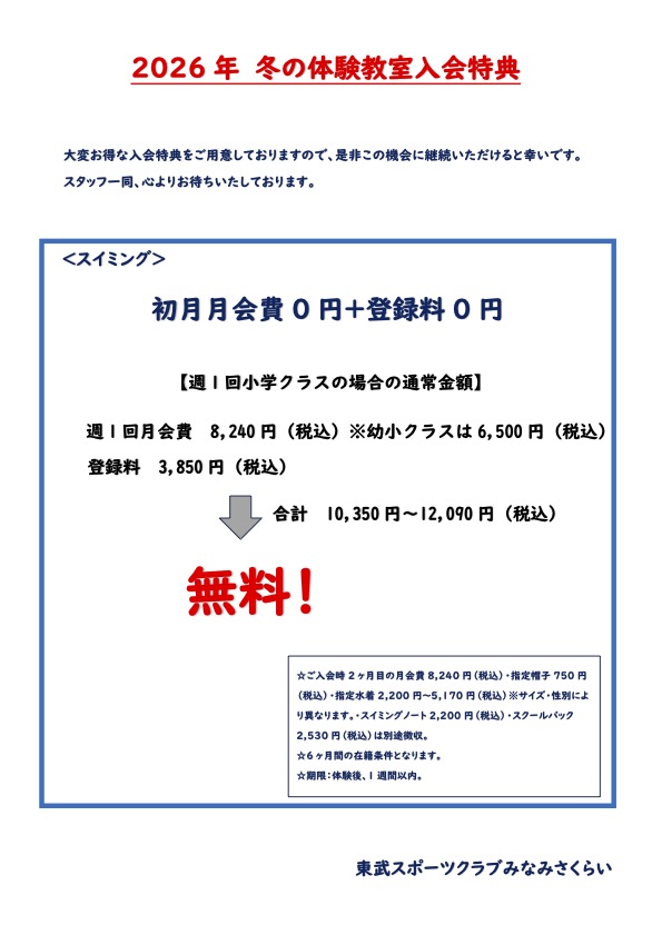 【一般】1月スイミング1日体験|東武スポーツみなみさくらい