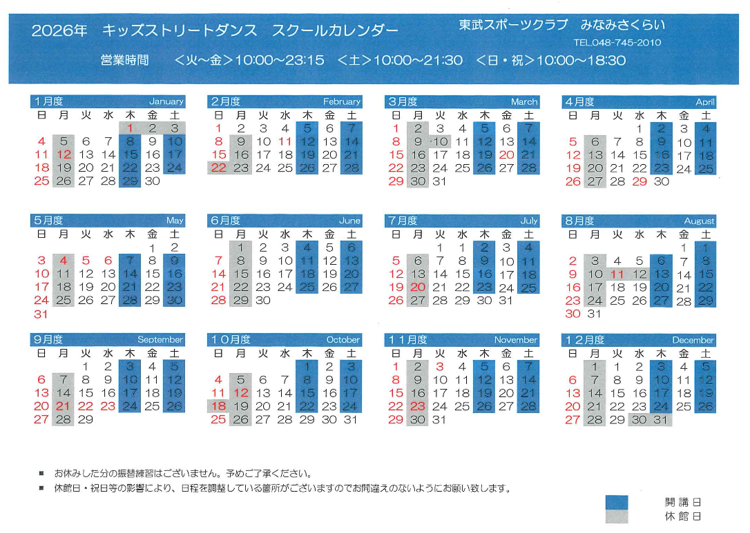 休館日やスクール休講日がございます。