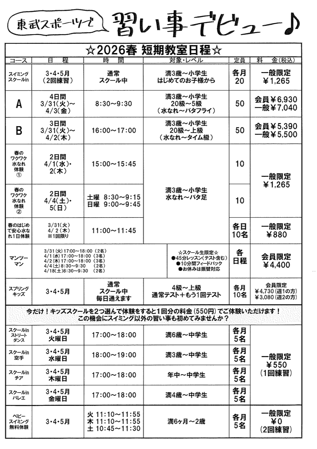 【一般】春のはじめて安心水なれ体験|東武スポーツおおわだ